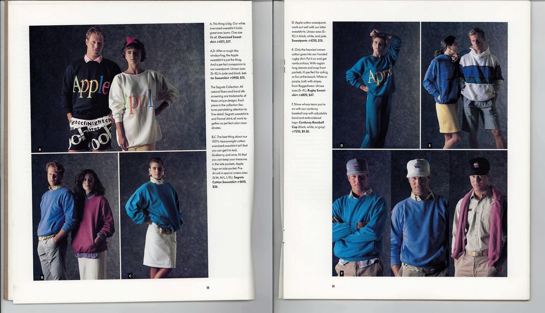Apple vend quelques vêtements et accessoires avec son logo, notamment des T-shirts, casquettes et stylos. Mais, en 1986, Apple a lancé une ligne de vêtements ambitieuse, sous le nom « The Apple Collection ». L'aventure n'a pas duré longtemps.