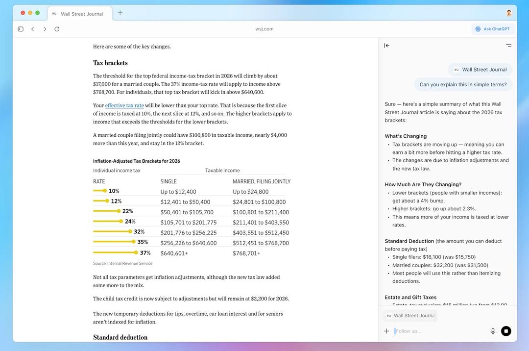 Le navigateur permet, par exemple, de faire un résumé clair d’un long article que vous avez affiché dans votre navigateur. © OpenAI